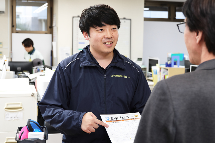 地域包括支援センターは、地域にお住まいの高齢者の方々の総合相談窓口。ご本人やご家族の様々な困りごとの解決に向けたサービスにつなげたり、介護保険認定のための訪問調査の調整や申請書の作成を行ったり。地域のお祭りやイベントでは福祉用具体験なども企画し、地域住民の介護予防活動やセンターの認知度アップを図るなど、幅広い業務に取り組んでいます。利用者の方から「ありがとう」と声をかけていただく時や、ケアマネージャーや医療職、地域の方などたくさんの人と関わる仕事で自分の周りの輪が広がっていくのはうれしいです。難しい支援でも周りの方の協力を得ながら進んでいくことが大きなやりがいにつながっています。