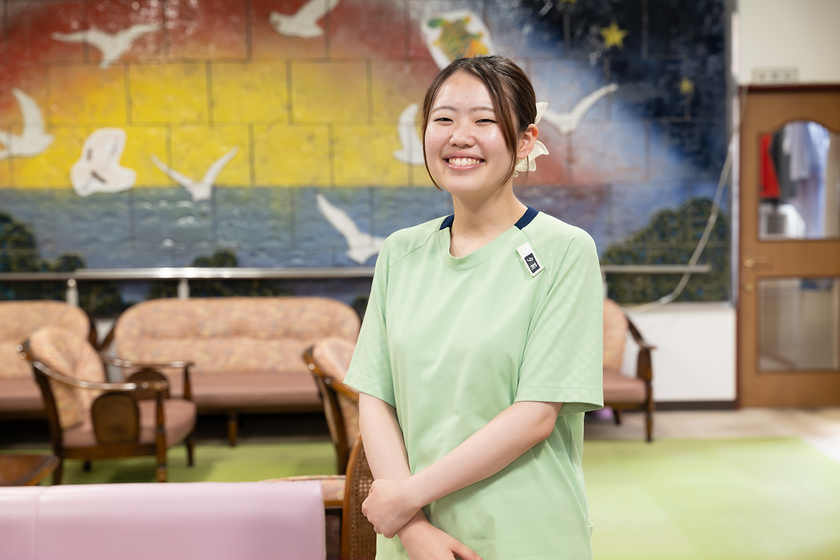 ケアハウス パシフィック勤務/介護福祉学科 卒/2025年卒/学生時代は寮長や行事の学生代表を務め、学祭の開催にも尽力。卒業後は、地域の方々と連携する経験を通じて磨いたコミュニケーション力を生かして利用者のサポートに力を注いでいる。「利用者のできない部分を支援し、できることを少しずつ増やすことで、『自分はこれができる』という自信を持ってもらいたい。それが生きがいにつながると思うんです」と語る。現在も学校や行事に顔を出し、後輩に体験談を話したり、日々の悩み事を先生方に相談したりしている。