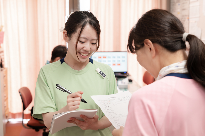 介護福祉士として、利用者の食事や入浴などの生活介助を行っています。力がいる仕事ではありますが、実際には介助よりも、コミュニケーションを通して利用者が求めていることを理解し、実践するためにどうしたらいいかと考えることに多くの時間を使っています。だからこそ、介助を通して笑顔が見られたり、歩けるようになったり、感謝の言葉をいただいたりしたときにやりがいを強く実感します。私の勤務する施設では、自立した生活をしている利用者も多く、高齢者の場合、転倒や骨折にも注意が必要です。一人ではできることも限られますが、利用者をはじめ職員の皆さんと一緒に頑張れることも、この仕事の楽しさだと思います。
