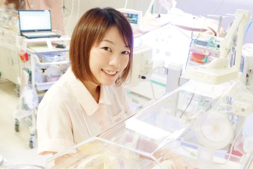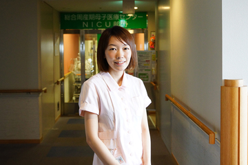 急性期の治療を必要としている新生児専門の「新生児特定集中治療室(NICU)」に所属しています。命に関わるプレッシャーの大きな仕事ですが、小さく生まれたり、障がいが残る可能性が高かった赤ちゃんが、健康になって笑顔で退院する姿に日々生命力のすごさを感じています。ご家族への言葉かけや退院指導にもこころを配るなかで、退院時に感謝の手紙をいただいたり、定期健診で元気に育っている姿を見ることが大きな励みになっています。お母さんとともに、一緒に悩んで育児について考え、その後、お母さんが主体的に育児する姿を目にすることも、やりがいにつながりますね。家族の決断や悩みに寄り添える助産師でありたいです。