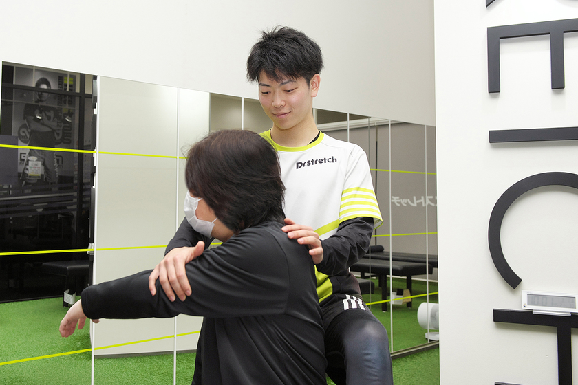 ストレッチトレーナーとして地域の方の健康をサポートしています。Dr.stretchは、全世界に240店舗以上を展開しているストレッチ専門店。独自技術「コアバランスストレッチ」を用いて、コリやハリを持つ深層筋をダイレクトに伸ばします。この仕事のやりがいは、お客様の筋肉をほぐすだけでなく、身体全体の健康に貢献できること。一人ひとりの体調や体質、ライフスタイルに適した中長期的なプランを立てて、無理せず着実にベストコンディションへと仕上げていきます。伸ばした腕が肩から上に上がらなかった方は、約半年かけて頭上まで上がるようになりました。同時に全身の健やかさを取り戻され、毎日をイキイキと過ごされています。