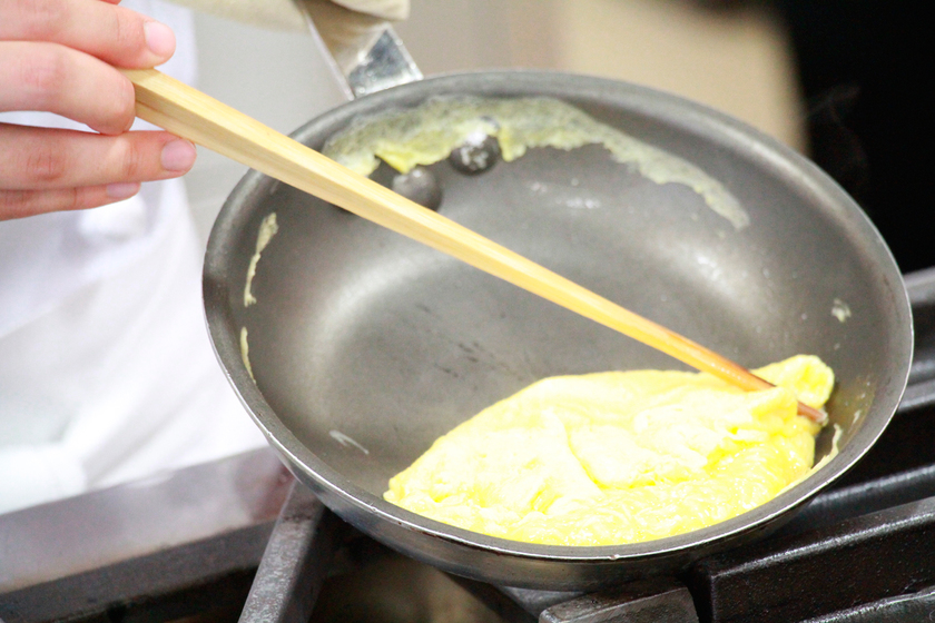 調理と製菓のどちらも学べることが、東京ベルエポック製菓調理学校を選んだ理由のひとつです。私は調理師科でしたが、パティシエの仕事にも興味があったので、調理師免許だけでなく、製菓衛生師(いずれも国家資格)を取得しました。どちらの分野のスキルも身につけることで、仕事の選択肢も広がり、結果的にパティシエの道に進むことができました。学生時代はとにかく練習の毎日。でも、これが本当に楽しかったんです。放課後はいつも残ってクラスメイトたちと自主練習をしていました。卵をたくさん買ってきてオムレツを作ったり、粉をこねてうどんを打ったり。時々先生方も指導してくれるので、技術を磨くためにも本当に役立ちました。
