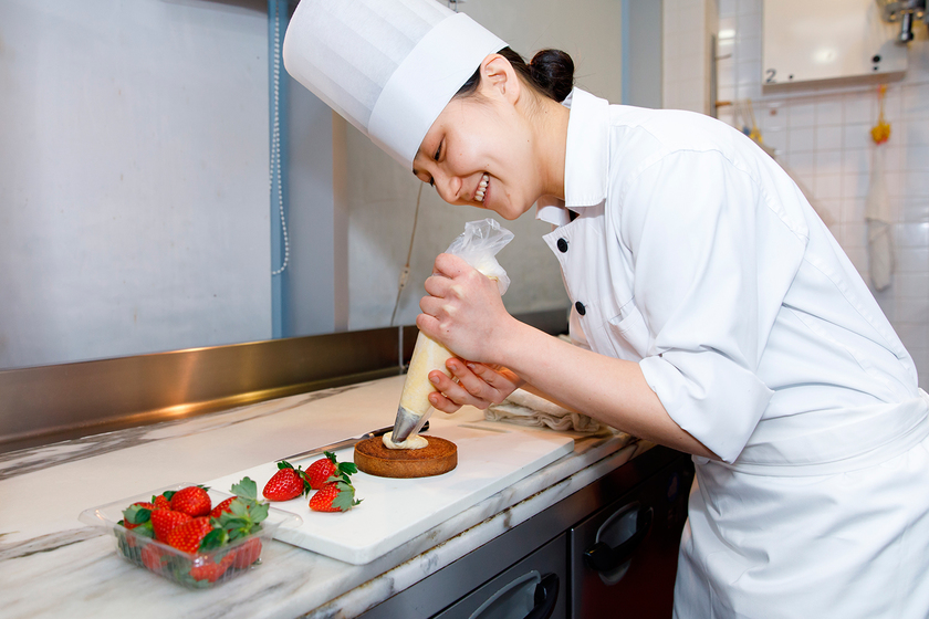 ただ「スイーツだ食べたい」ではなく、「清水美紀が作ったスイーツが食べたい」と、お客さまに言っていただけるものを作れるようになりたいと思っています。今はまだ駆け出しで、「これが私の自信作」といえるものはありませんが、目標は常に高く持ち、その実現に向けて頑張っています。そのために今私ができることは、先輩たちの技術を盗むことです。この道のプロたちの仕事は本当に素晴らしいので、合間を見て、パティシエの手元を観察し、わからないことがあればとことん質問します。我ながらしつこいなと思うほどですが、職場の先輩たちがどんな質問にもていねいに答えてくれるので、本当に感謝の気持ちでいっぱいです。