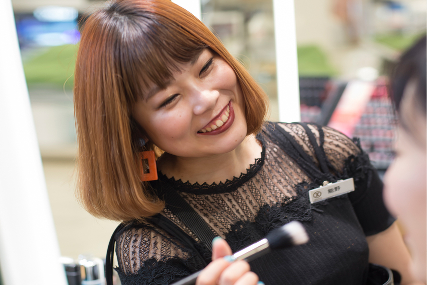 M・A・Cで美容部員として働いています。美容部員の役割は、お客様に合わせたメイク用品を提案したり、メイクを施すことを通して、お客様の美しさを引き出すこと。豊富な商品知識やメイクの技術をはじめ、肌のこと、健康のことなど、さまざまな専門知識が必要ですし、何より接客力が欠かせません。一見とても華やかなイメージを持たれる仕事ですが、大変なこともたくさんあります。けれども自分の技術や知識で、お客様を美しく、そして笑顔にできることは、私にとって誇りや自信にもつながる、やりがいの大きな仕事。これからも技術を高め、たくさんのお客様を笑顔にできたら、と思っています。