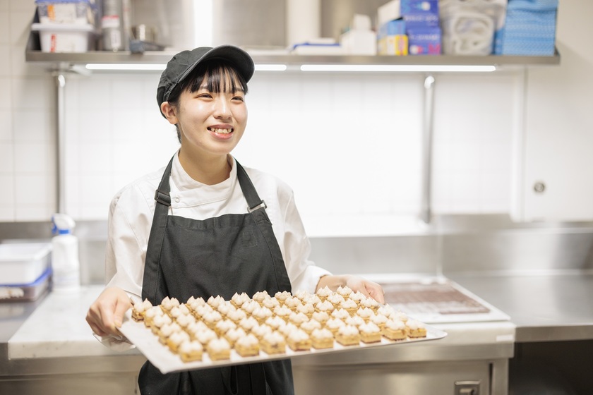 小さい頃から母親と一緒にパンやお菓子を作るのがとても楽しくて、将来はお菓子作りを仕事にしたいと思ったのが始まりでした。小学5年生の時に父が知り合いのパティスリーを紹介してくれて、そこで1日職業体験をしたことがあり、パティシエになりたいと思うようになりました。進学先として赤堀製菓専門学校を選んだのは、在学中に製菓衛生師の資格が取れることと、有名な企業さんとのコラボ実習に魅力を感じたから。そして在学中のアルバイトを通じて、ホテルで働くことの楽しさを知ったのが大きかったです。お客様の旅の一部として関わり、自分が作ったお菓子が良い思い出になったらいいな、と思ってホテルで働くことを選びました。