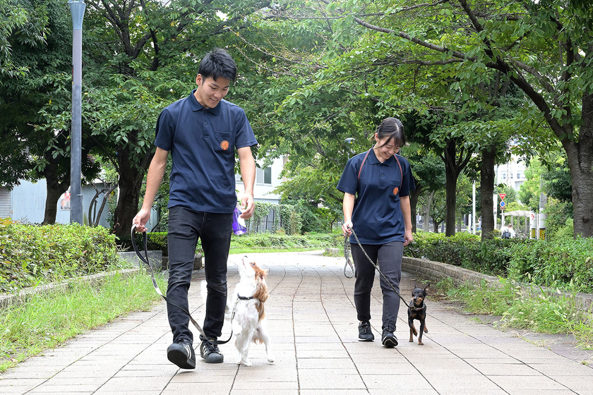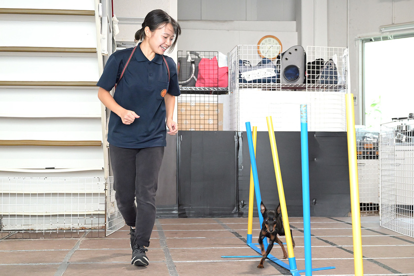 いぬの幼稚園バウバウ勤務/ペットビジネス科 ドッグトレーナー専攻/2019年卒/祖母の飼っていた犬との出会いから、犬が大好きに。進路決定時には、どこよりも犬のことを深く学べると感じた大阪ECO動物海洋専門学校に入学した。学生時代は、ドッグトレーニングや警察犬ゼミなど、実習授業に意欲的に取り組み、体験入学をサポートする学生スタッフとしての活動にも挑戦した。現在の職場では、学校で学んだ犬とのコミュニケーションの取り方やドッグトレーニングスキルを活かして活躍。