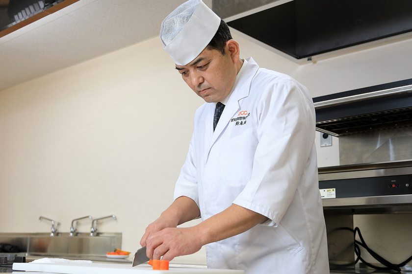 【感謝】【愛情】【思いやり】という心得を大切に行われる実習。「この3つの気持ちを持って調理しているかどうかが大事。心得を持って作った料理とそうでないものでは味が違います」と鈴木田先生。また、実技テストの課題となる基本技術はもちろん、応用技を何通りも見せ、学生の向上心を刺激することも。「学校での失敗は自分を成長させてくれます。学生である今はいろんなことに挑戦し、失敗をたくさん経験して成長してほしいです」