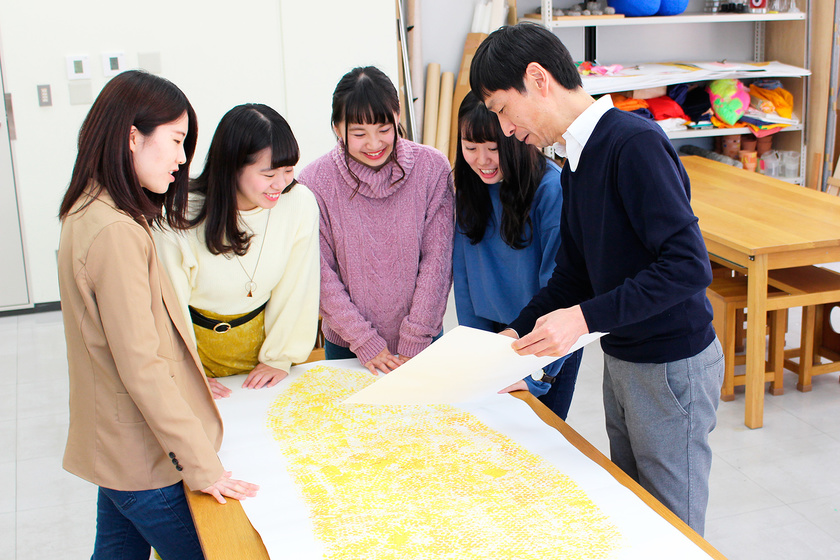 造形表現の演習科目を担当する捧先生。授業では、学生の前で実際にデモンストレーションを行い、一緒に作品制作に取り組み、表現することの楽しさを伝えているそうです。造形表現とは、手と眼と頭を連動させながら全身運動で行うものとのこと。特に保育での造形表現は、技術の上手下手を競うものではなく、豊かな感性の養いがテーマとなり、表現することの楽しさや学生一人ひとりが自分の個性を発見していくことが重要だと捧先生は言います。入学時に絵を描いたりすることが苦手な学生も、自然と制作表現が好きになっていくそうです。