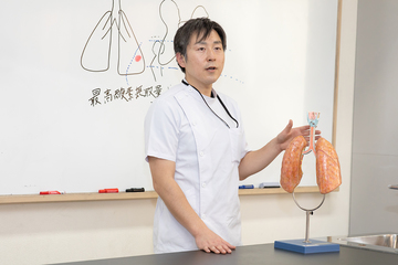 巻教授の授業では、実際の医療現場で使われる心電図や呼吸機能検査(肺活量等測定)といった機器を用いて、患者様が医療現場で体験される場面を再現し、障害を持った方に対するアプローチの方法を予防の視点から実践的に学ぶことができます。授業は1クラス40名の少人数制で、きめ細やかで丁寧な指導が特長。臨床現場での経験が少ない学生にもわかりやすい講義を心がけているため、患者様の生活背景などを想定しながら、リハビリを通じて生活の質を向上可能な支援ができるスペシャリストを目指せます。