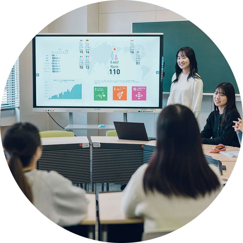 社会や政治、教育、福祉など、さまざまな分野の身近なテーマから、ジェンダーや女性の多様な生き方について学びます。さまざまな人の背景を的確に理解し、相手に配慮して行動できる力は、企業でのチームづくりやサービス開発、教育・福祉現場など、あらゆる仕事で必要とされるものです。ジェンダーを学ぶことで、誰もが働きやすい社会をつくる視点が身に付きます。
