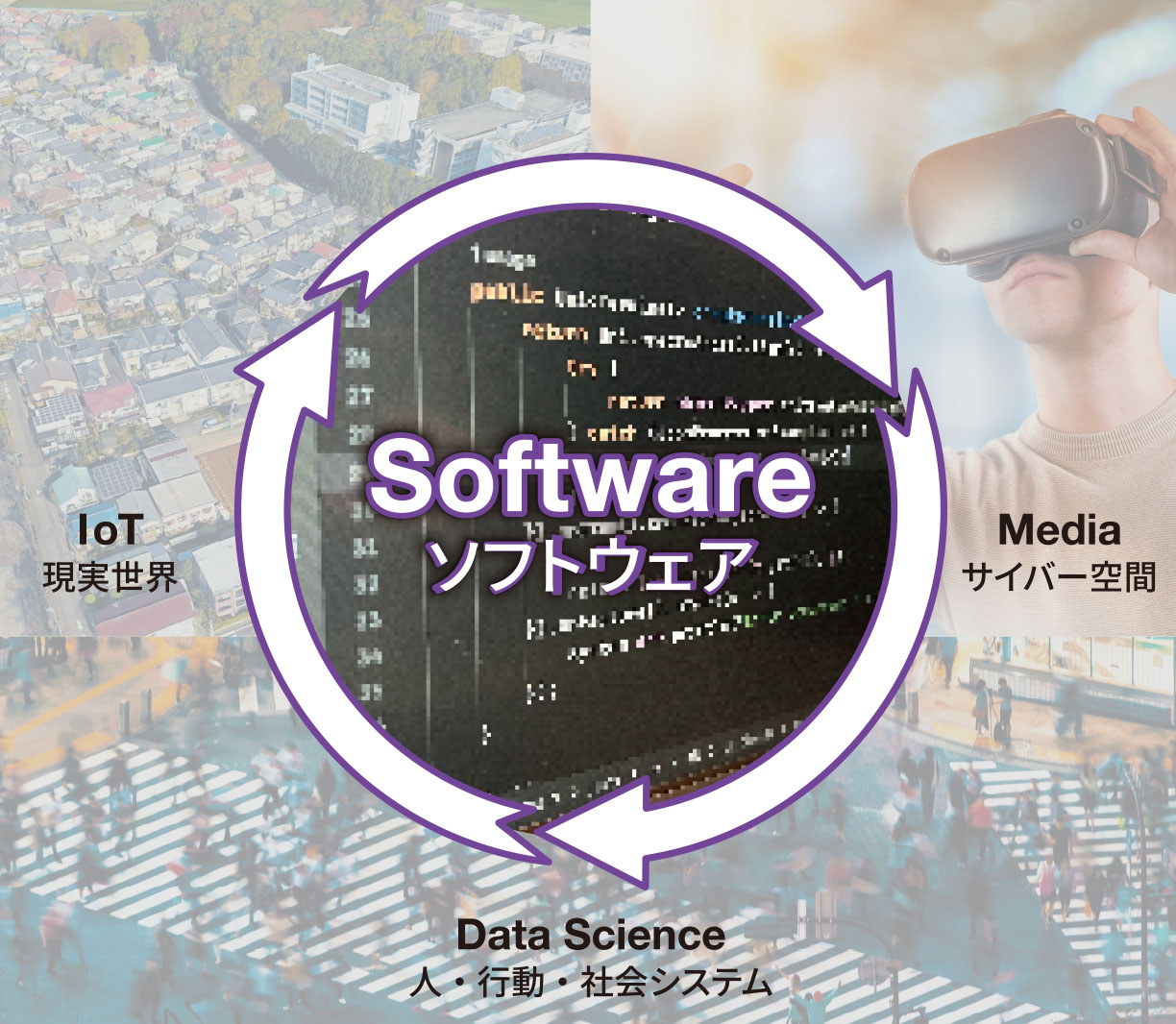 デジタル技術と現実世界を高度に融合させたCPS*1の構築とSociety 5.0*2の実現を基盤としたデジタル社会への適応を目指し、ソフトウェア工学に精通し、プログラミング技術を駆使して、社会的ニーズに適切に対応したソフトウェアを開発できる人材となります。