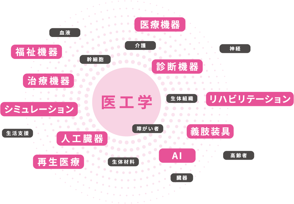 生体機能を回復・補助する医療・福祉に貢献できる人材を養成します。そのために、医工学の幅広い専門知識・技術・論理的思考力、研究倫理観を修得します。また、分子や遺伝子レベルから細胞、個体に至るまで、さまざまな観点から発達や加齢といった生命現象の機序(メカニズム)を解明する研究をはじめ、医療や人々の生活を支援する科学技術の開発を通して、健康寿命の延伸と人々のQOL(Quality of Life、生活の質)向上に貢献します。