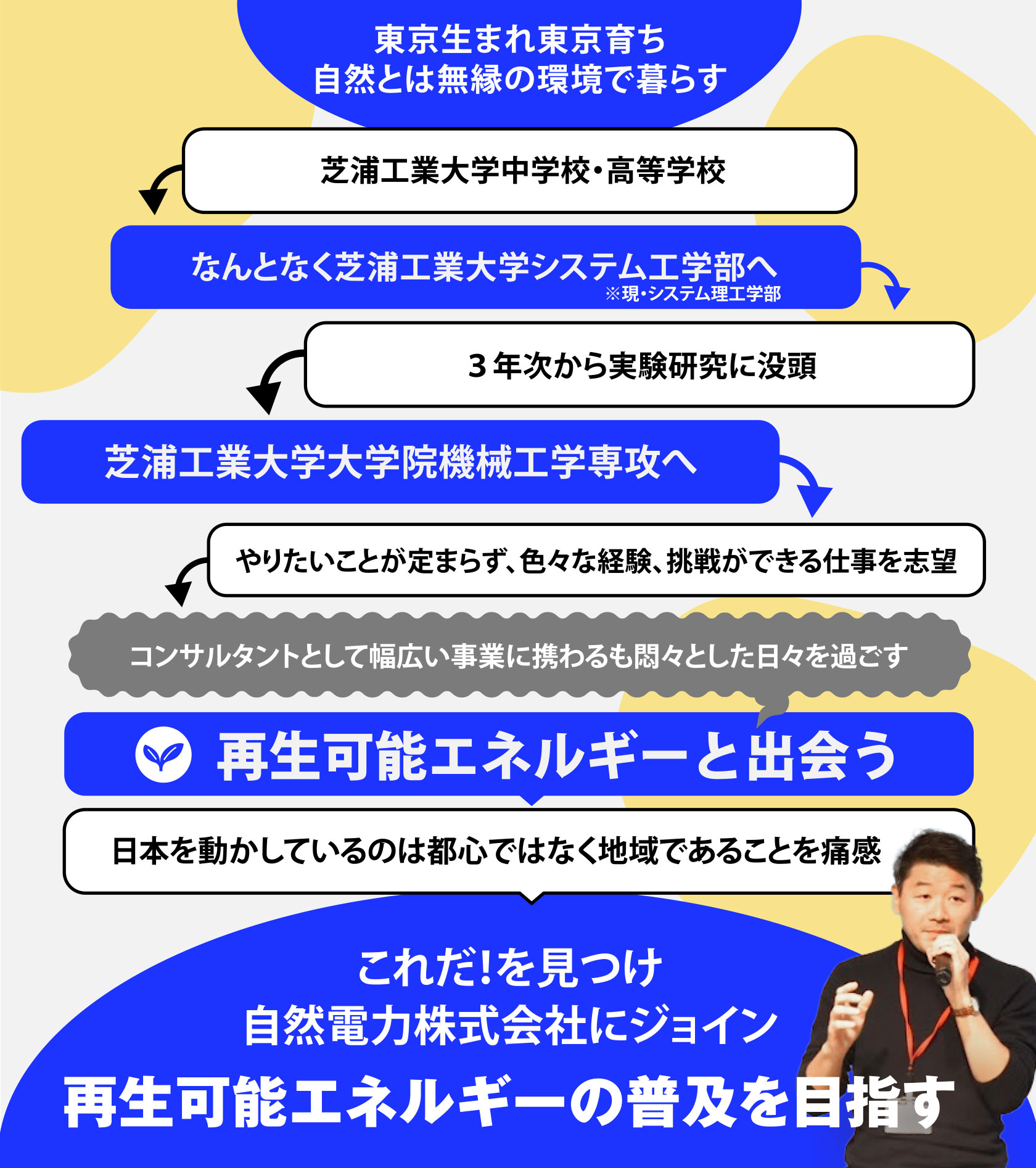 私は現在の仕事を天職だと思っていますが、高校生のころはやりたいことがわからず、システム工学部を選んだ理由も「なんとなく」でした。大学院修了後にコンサルティング会社に就職したのも「幅広い業種、幅広い事業に携わるなかで自分が夢中になれることを探したい」と考えたから。それでも悶々とする私の前に現れたのが、再生可能エネルギーの仕事でした。東京で生まれ、東京で育ち、東京で働いてきた私は、どこかで「日本は東京を中心に回っている」と思い込んでいたのでしょう。エネルギーの最前線が「地域」であること、日本が地域の積み重ねでできていることに改めて気づき、その可能性の大きさ、その自然の美しさに「これだ!」と思ったことは今でも鮮明に覚えています。私はたくさん迷ってきましたが、ムダなことはひとつもなかったと思いますし、「だからこそ天職にたどりつけた」とも言えるかもしれません。将来について迷うことは健全なこと。大切なのは、天職があると信じて探し続けることではないでしょうか。昔の自分に伝えたいことでもありますが、高校生のみなさんにはぜひ、若いうちから自分の外にある色々な世界に触れてほしい。そして思うぞんぶん迷って、この世界のどこかであなたを待つ天職を拾い上げてほしいと思います。