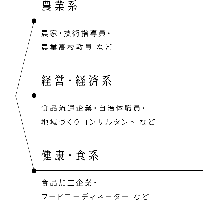 作物を育てるだけでなく、地域創生や農業ビジネスまで広く学びます。だから、卒業後の進路もひとつではありません。農家や農業高校の先生、フードコーディネーター、公務員、地域づくりコンサルタントなど、“食”と“地域”につながる多彩な仕事へ道が開けます。未来の選択肢も豊かに育つ、農学部なんです。